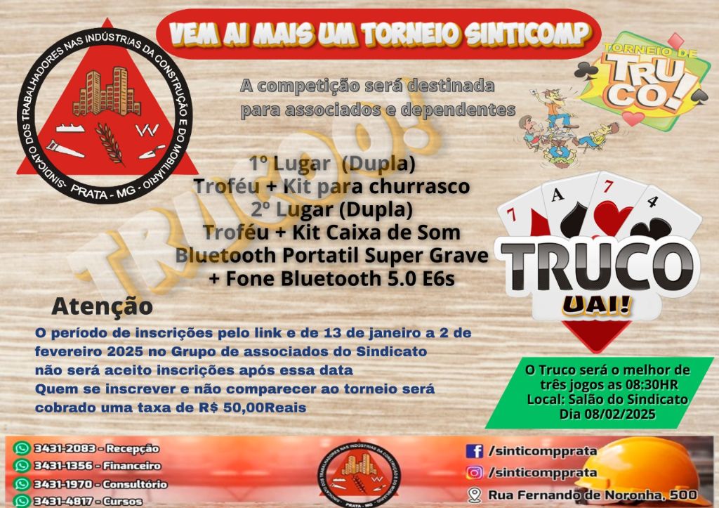 A diretoria de Esportes do SINTICOMP PRATA, promoveu este fim de semana, novo torneio de Truco, entre associados e dependentes na sede do Sindicato…
